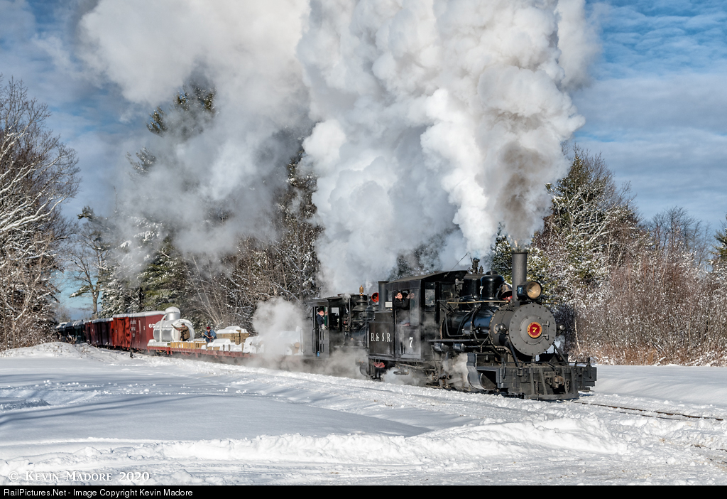 The "Mega-train". With just about every roadable freight and passenger car from the combined collections of the Maine Narrow Gauge Railroad Company & Museum, and the WW&F Museum, B&SR Locomotive #7 and WW&F Locomotive #9 double-head the longest train of any kind to ever run at the 30 year-old WW&F Museum during the January, 2020 Grand Reunion event. Although most of Maine's 2-foot railroads didn't typically run long or double-headed trains, it did happen on occasion and there are historic photos depicting some of these rare operations. Although built with mixed railroad power and rolling stock, the 13-car train depicted here at Alna Center on the WW&F main line was intended to represent such operations. Not only was this train impressive to listen to and watch, but apparently it was also a real hoot for the crews, who are more used to trains of less than half that length. Note the two Brakemen riding the flats just in front of the tank car. These two young gentlemen were manning the hand brakes, as none of the cars on this train had air or vacuum brakes. Although both locomotives had brakes, the rest of the train was controlled by a large team of brakemen, each of whom was responsible for a particular car.