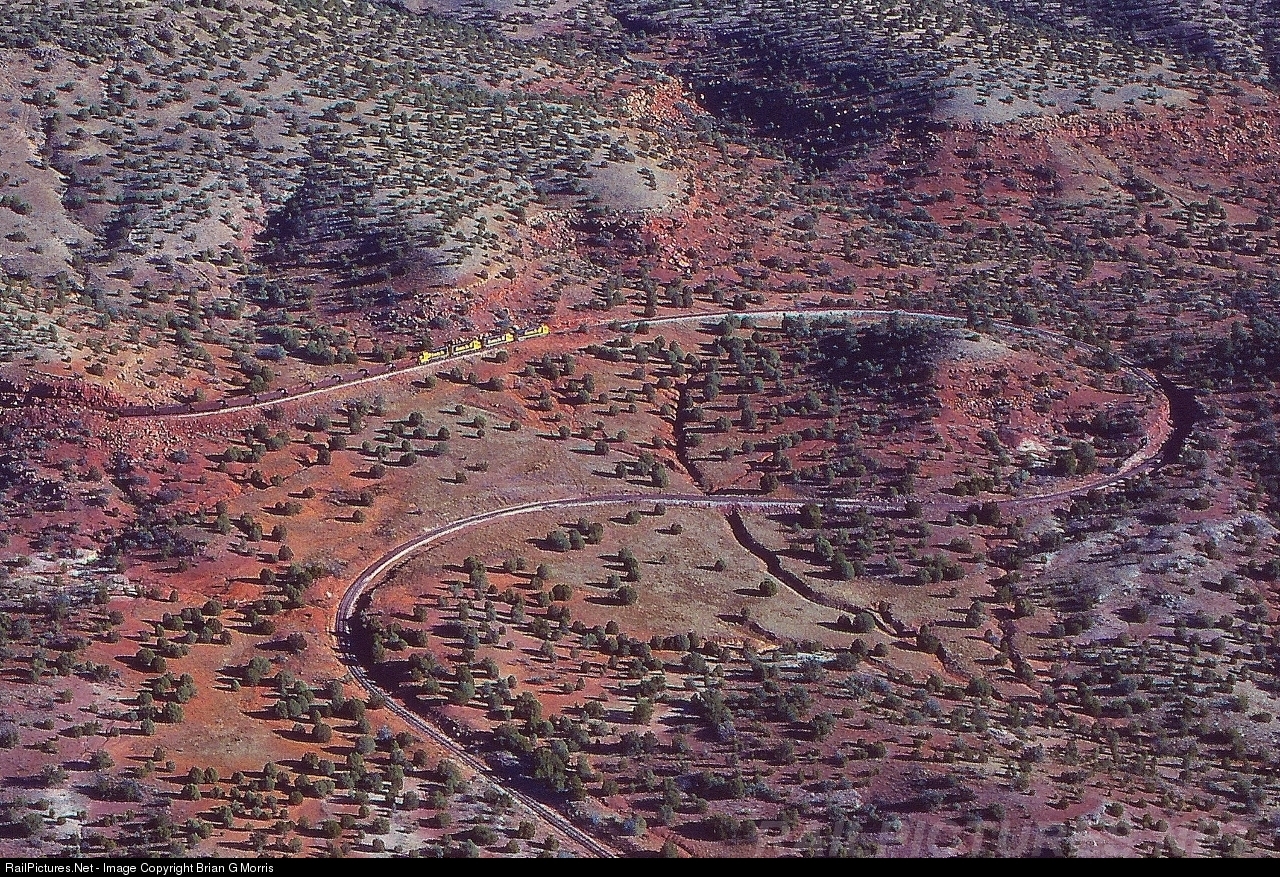 A Santa Fe local on the Clarkdale Branch. This remote Brach Is now the Verde Canyon Railway. Much of this Beautiful line Can Only Be reached By riding the Train or By Air. I got many Shots of itThanks To My Friend Don and His Airplane