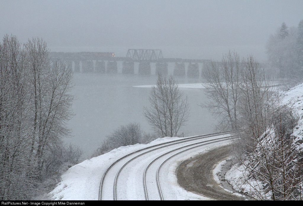 Almost lost in the falling snow is an approaching westbound BNSF coal train crossing the long bridge over Lake Pend Oreille at Sandpoint, Idaho, on January 28, 2020. BNSF is busy working on the approaches of a new parallel bridge that will soon be built allowing double track on this bottleneck on the “funnel” between Sandpoint Junction and Spokane.