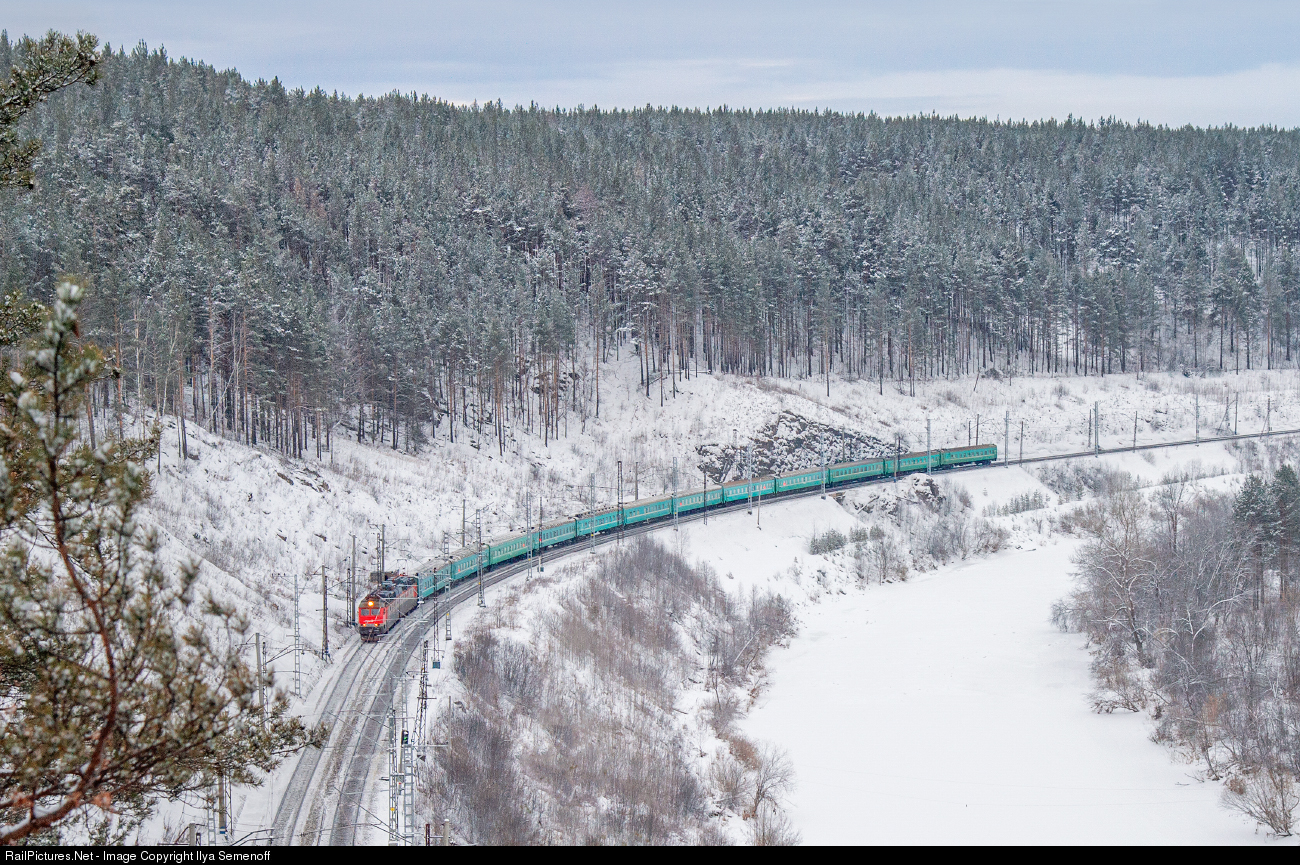 ChS7 DC electric locomotive goes with passenger train from Kazakhstan at Trans-Siberian Railway near Ust-Katav city at the south of the Ural mountains. At that point the river forms the border between the two regions of Russia - Republic of Bashkortostan and the Chelyabinsk region.