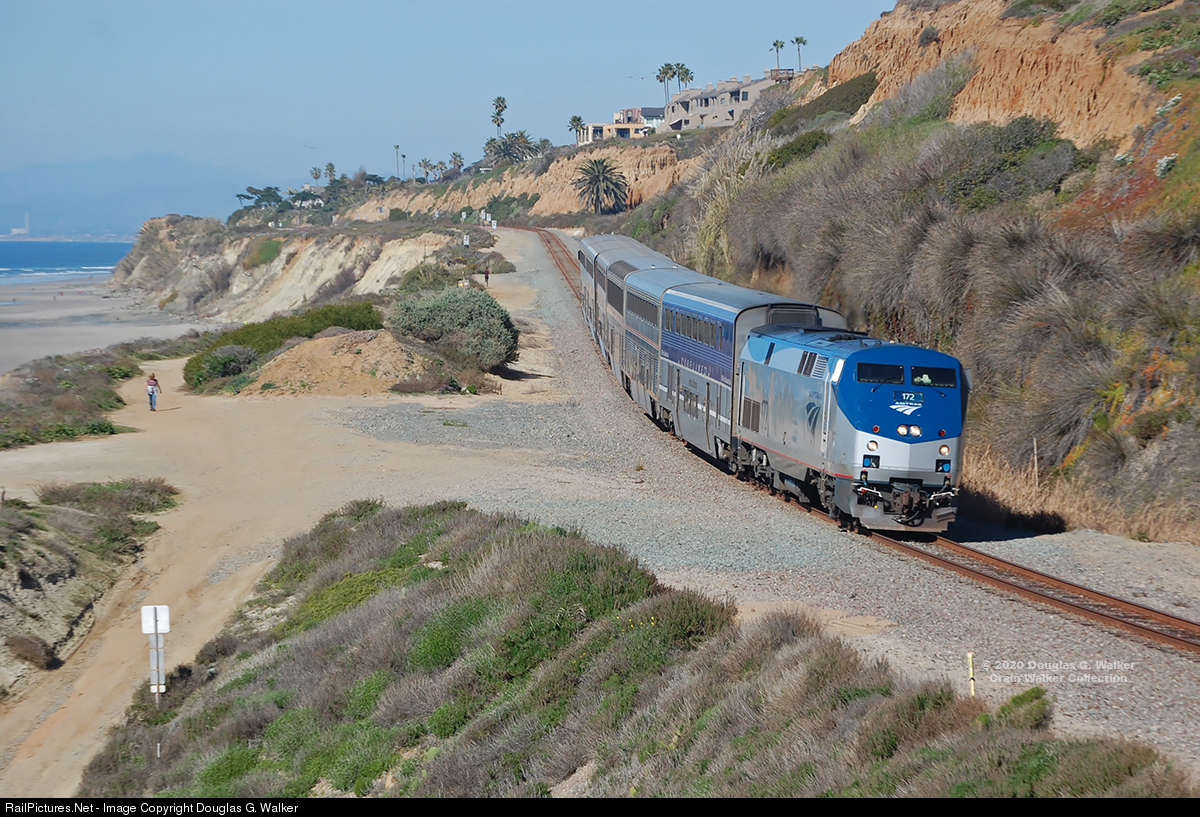 Skirting the Pacific Ocean, Amtrak train 572 is living up to its Pacific Surfliner name as it skirts the beach along the expensive real estate of the Del Mar Bluffs. Amtrak P42DC 172, a June 2001 General Electric product, is in charge of this 6-car train (which includes a Superliner lounge, not usually common on these trains) as it nears San Diego, having originated in Los Angeles. (Del Mar, California – February 6, 2020)