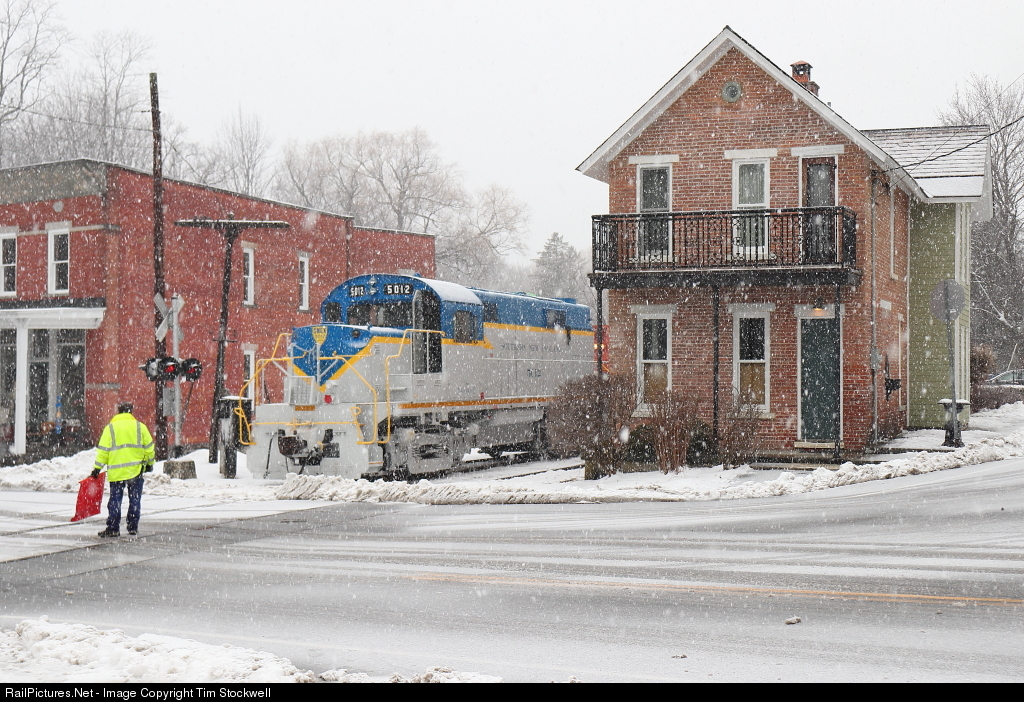 A new but once familiar sight graced the rails of the Batten Kill Railroad on Friday, February 7th when Southern New England Alco RS-36 #5012 in a D&H lightning stripe-inspired scheme traversed the line between Eagle Bridge, NY and Greenwich Junction, NY. The 5012 trailed BKRR Alco RS-3 #4116 on the northbound train this day, but a couple of switching maneuvers here at Shushan allowed this view of the engine by itself. The sight of a D&H lightning stripe-painted engine has not been seen on this line since the D&H sold its Washington Branch to the Batten Kill Railroad in 1982. Southern New England Railroad is a locomotive leasing company, and current plans for the 5012 are mostly storage until another railroad leases it.