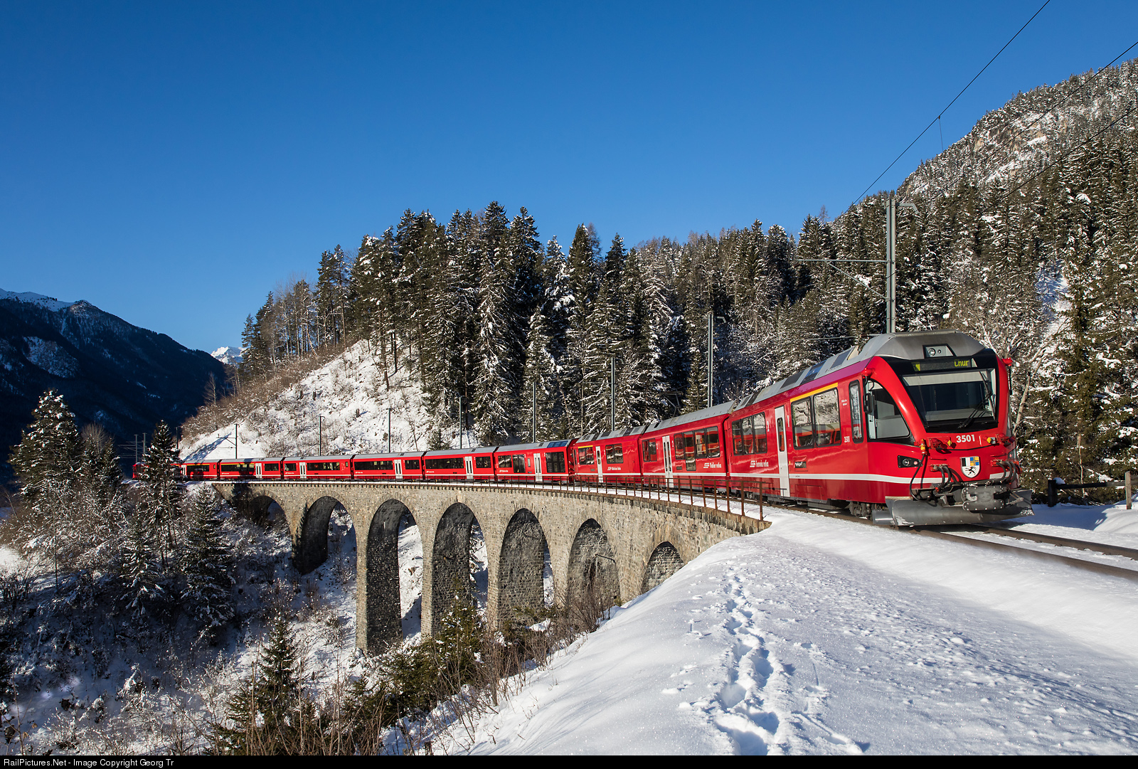 | Interregio 1124 of the Rhaetian Railway from St.Moritz to Chur is crossing the 35 meter high and 137 meter long Schmittentobel viaduct between Filisur and Alvaneu. Railcar "Allegra" ABe 8/12 # 3501 is shoving the permanently coupled 6 car ALVRA trainset and the second class cab car Bt # 52808 (instead of a planned first class At). |