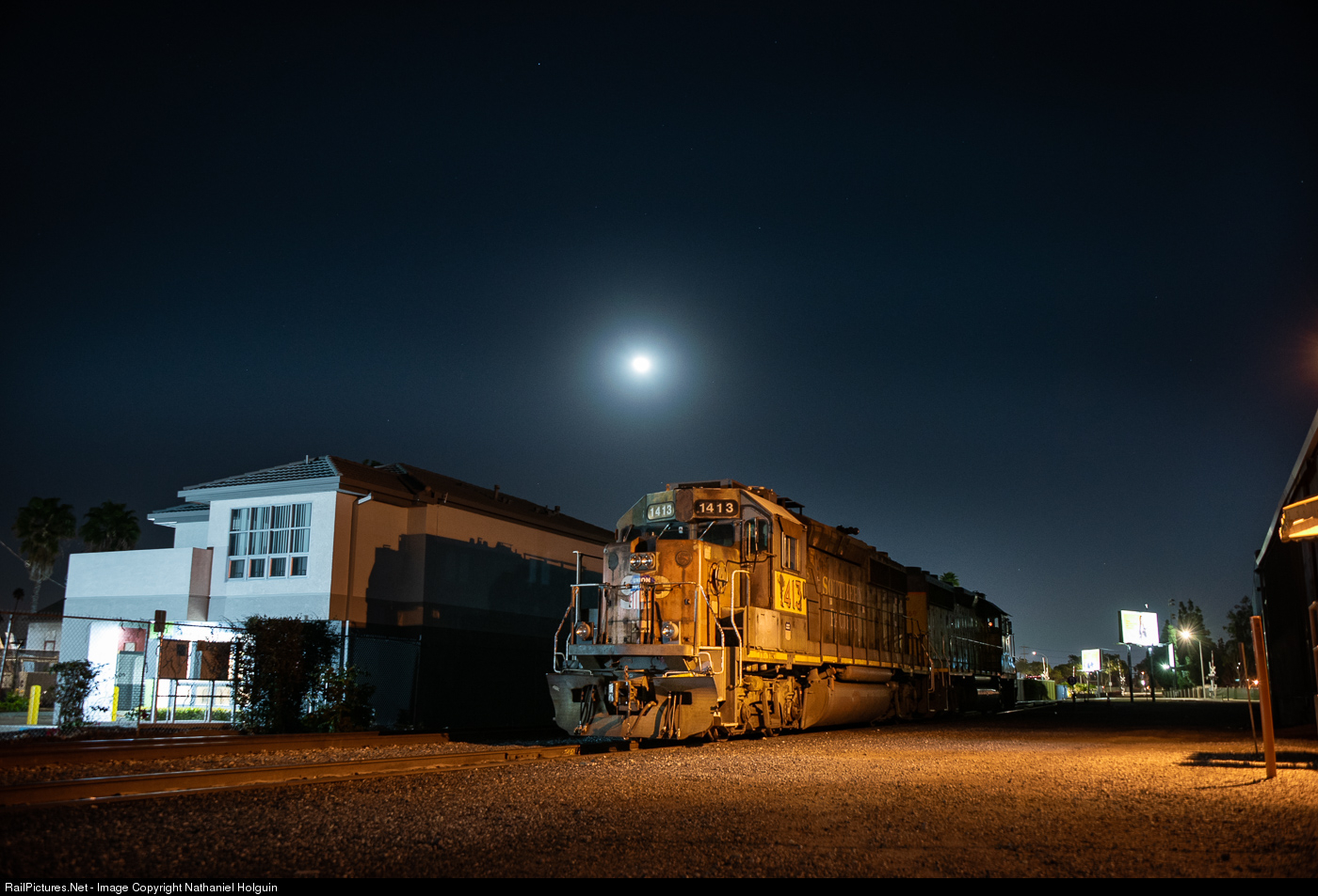 A unit sporting a very old SP paint schemes rests under this week's super-moon in Anaheim. The next morning, the power set will be working the multiple industries that Union Pacific serves in Orange County.