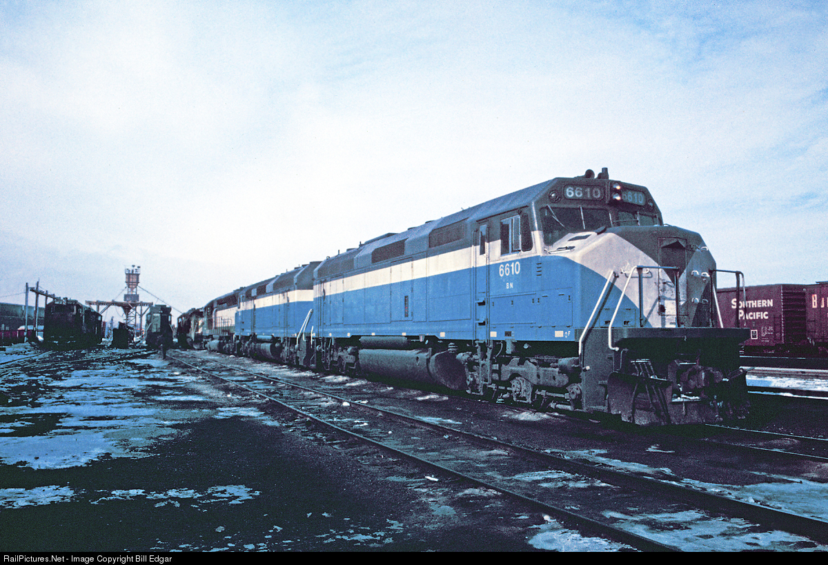 | A pair of X-GN F45s mate up with a former CB&Q SD45 at Cicero, IL on a dreary March day in 1974. Newer BN units are in the background along with an older GE unit. |