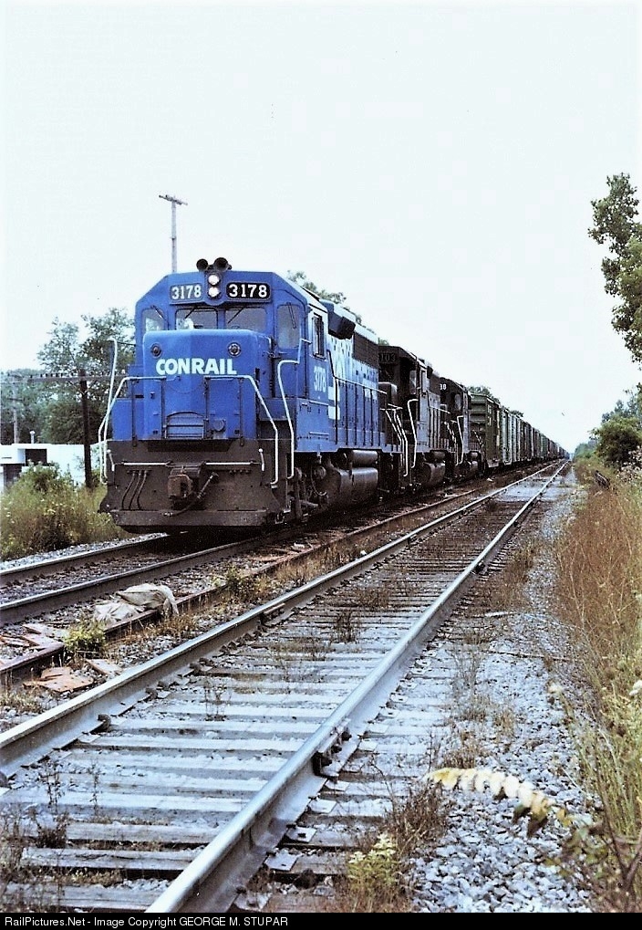 | Conrail GP40 3178 leads an eastbound through the community of Miller, at milepost 492 on the Chicago Line, in 1978. |