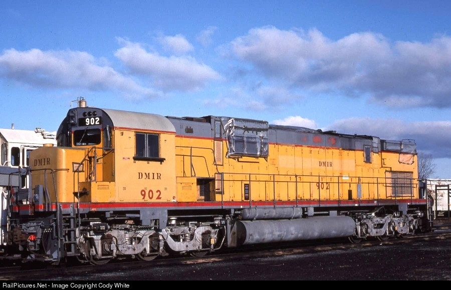 Duluth Missabe and Iron Range C630 902 resting at N. Fond Du Lac WI April 1976. The 902 is on it's way to Cartier Mining Railway in Quebec and is being forwarded by the Soo Line to presumably Chicago for movement east. The 902 was built as Union Pacific 2902 in May 1966 and retired by the UP in November 1973. At the time the UP disposed of these big Alcos, The Missabe was experiencing a power shortage due to their orders at EMD being backordered. The Missabe picked up these Alco brutes and used them on jobs close to Proctor due to reliability issues. These units never wore Missabe paint and were renumbered by simply dropping the 2 from the UP number. These were not the first Alco units operated by the Missabe as they had a fleet of RSD15 units built in 1959 but they were sent to sister US Steel road Bessemer and Lake Erie in the early 60s. Unknown Photographer photo from my collection.
