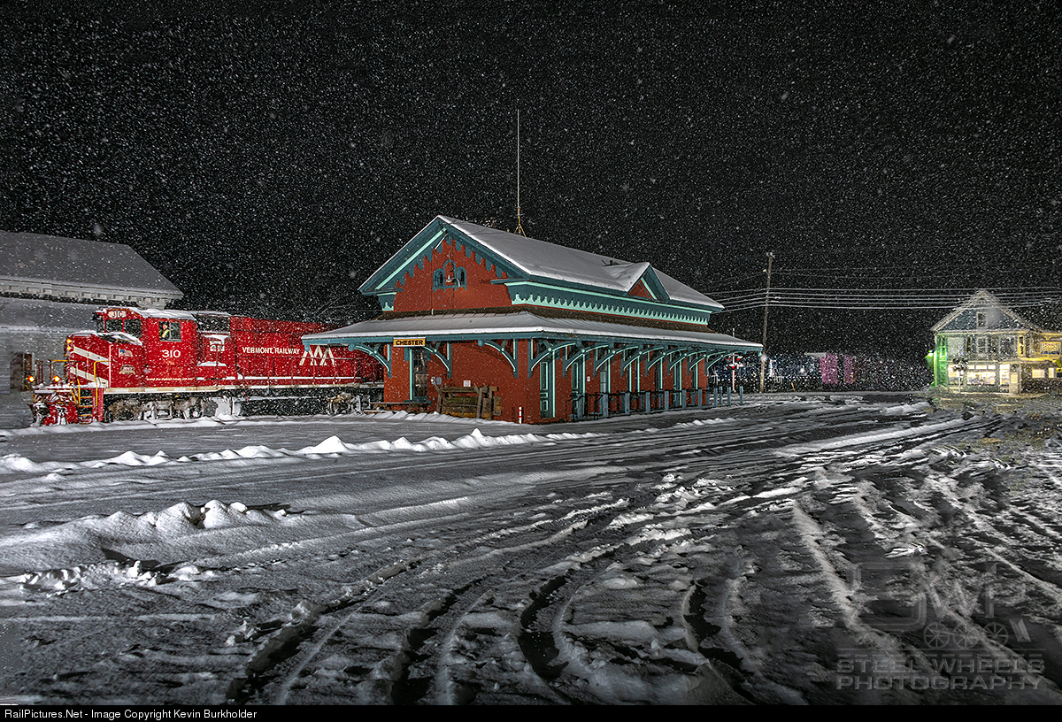 The Tuesday, February 18 Pan Am Southern detour train 11R-18 is seen passing the Chester Depot station in with Vermont Railway GP40-2L 310 leading Pan Am B40-8s 5976, 5930, 5936, and 5946, and distantly visible in the heavy snowfall is the pink TTX FBOX On Track for a Cure boxcar, FBOX 504927!