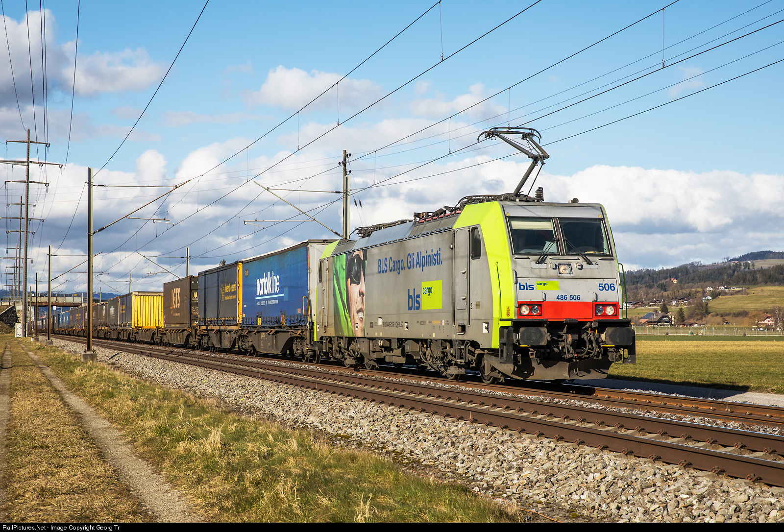 | Re 486 # 506 of BLS Cargo (Bombardier TRAXX F140 MS built in 2008) is pulling the about 1300 ton southbound intermodal train 43525 from Zeebrugge-Ramskapelle/Belgium to Piacenza/Italy on the Aaretal line between Wichtrach and Kiesen (between Bern and Thun) towards the Lötschberg Base Tunnel (LBT) and the Simplon. |