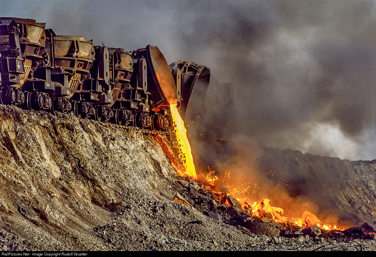 A slag car discharges its load of molten slag.