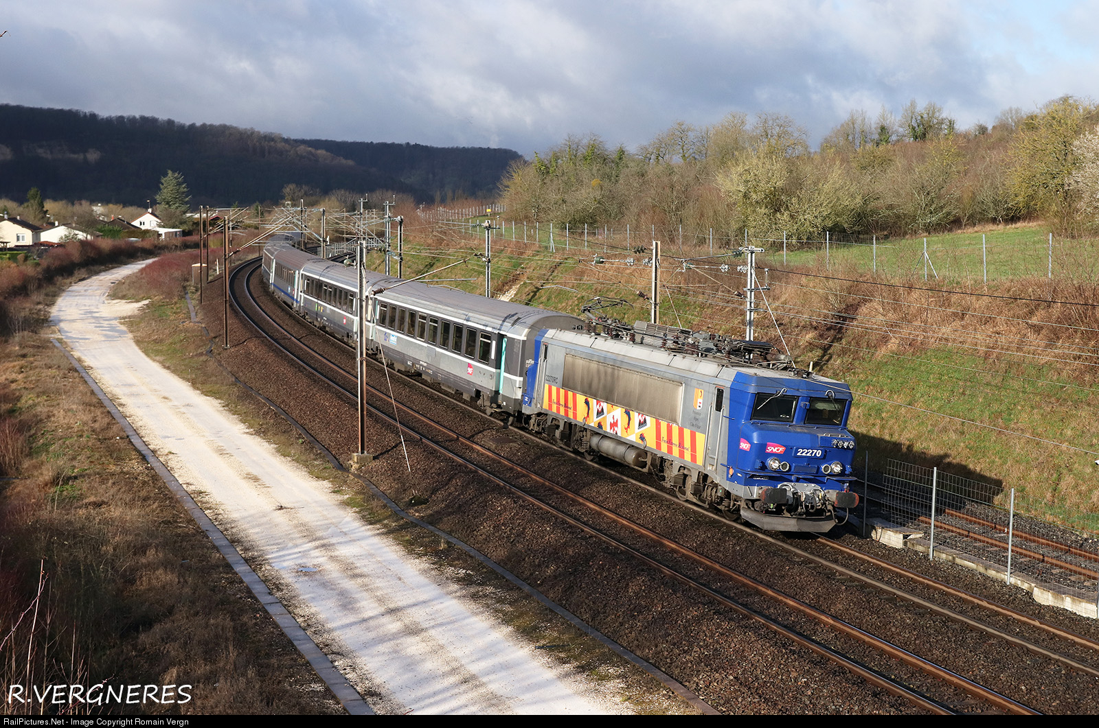 | In full curve near Nançois sur Ornain, the BB 22270 will attack the Loxéville ramp, at the head of 839161: Paris Est - Strasbourg. |