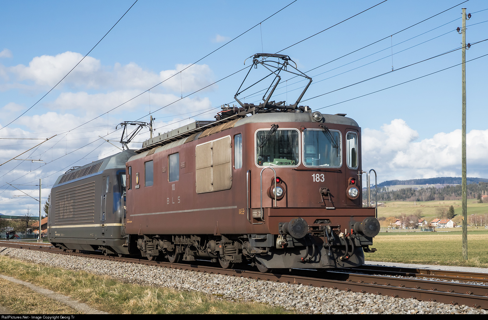 | Re 425 (Re 4/4) # 183 and Re 465 # 017 of the BLS in multiple control are running light from Spiez to Cornaux to pull a tank car train, between Kiesen and Wichtrach in the Aare valley. |