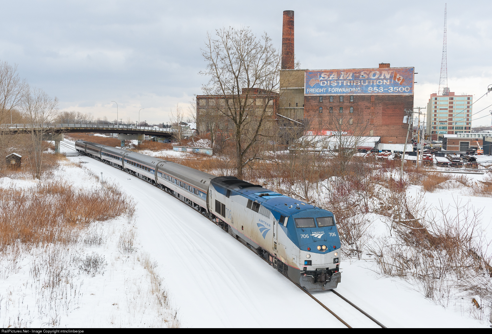 Amtrak 281 is enroute between the station in Depew and the Exchange Street Station in downtown Buffalo. The Sam-Son Distribution stands in the background as P32AC-DM 706 leads the train.