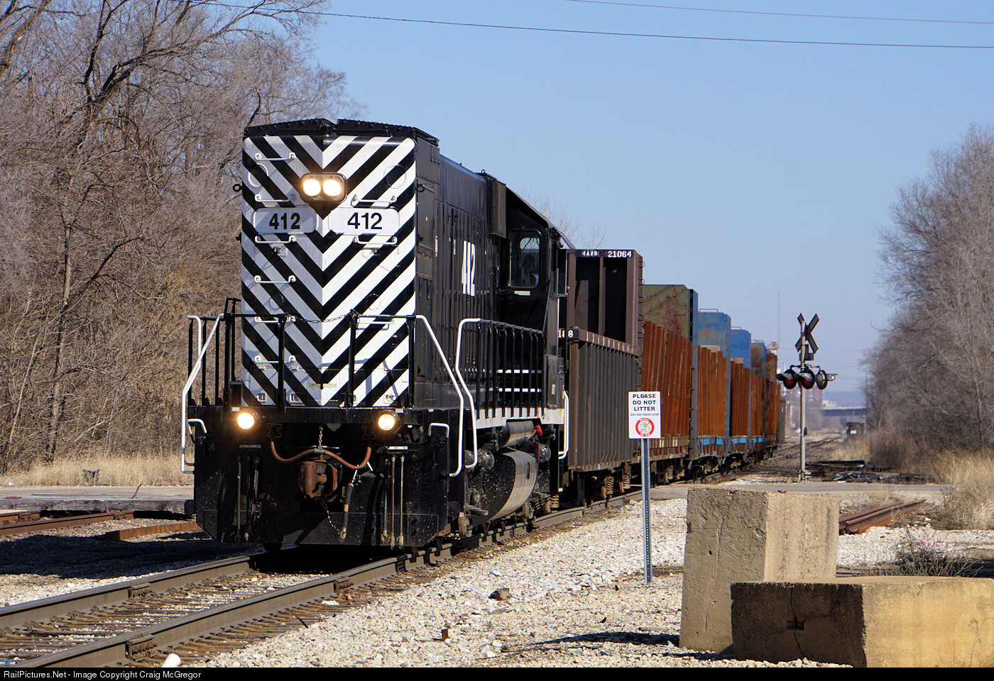Tazewell & Peoria's "Kickapoo Job" heads towards Kickapoo Yard (named since Kickapoo Creek runs into the Illinois River nearby) with empty flats to serve reloading at Liberty Steel's wire mill in Bartonville. The sign seems to be a friendly reminder.
