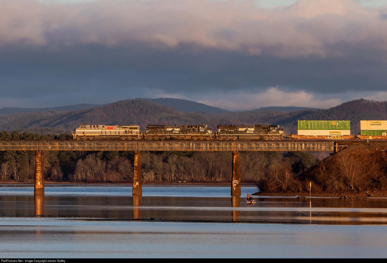 Morning breaks over Lake Hartwell and the SC/GA state line as the Monongahela heritage unit greats the fishermen and bears down for the grade up the north Georgia mountains.