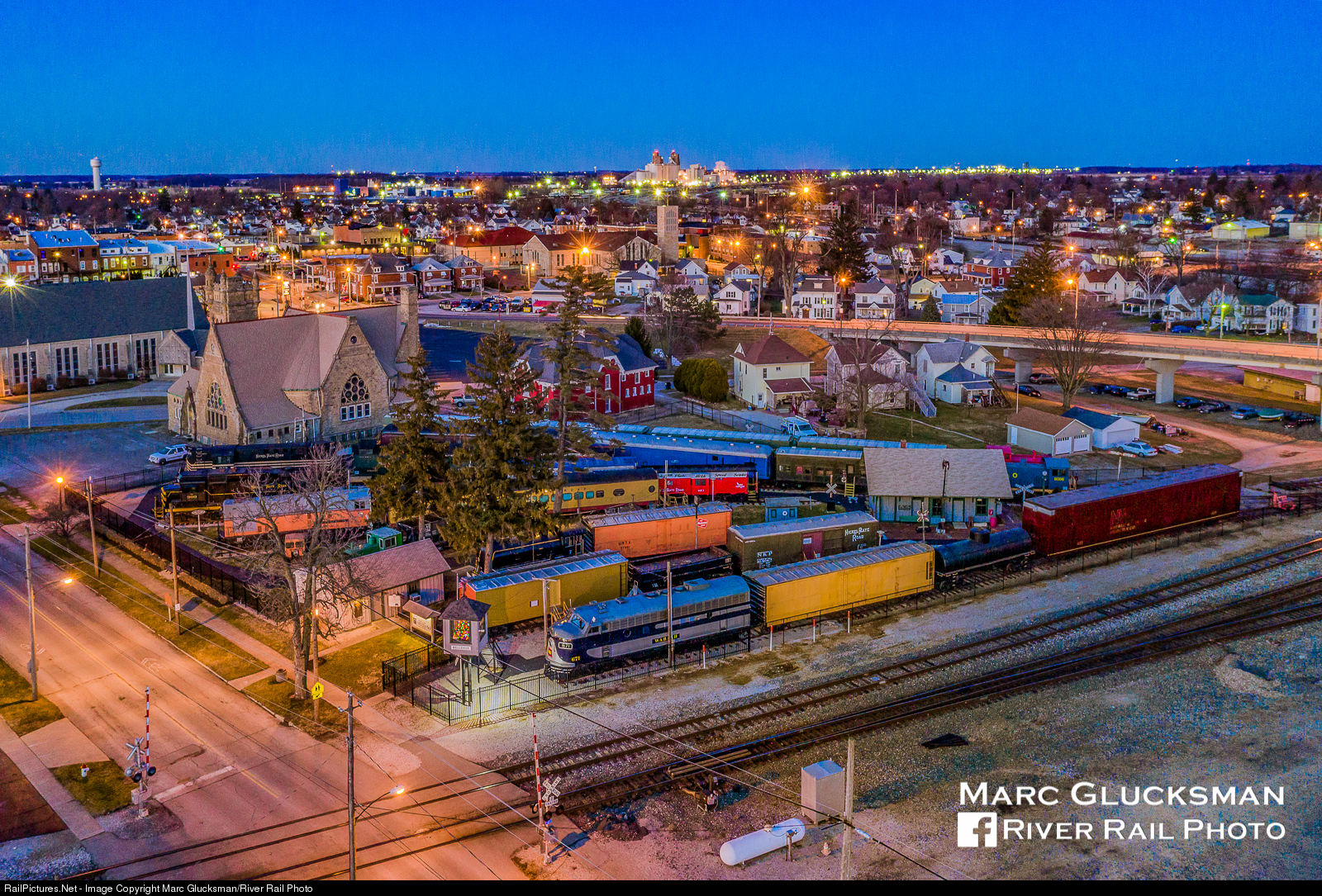 A large portion of the outdoor collection of the Mad River & NKP Railroad Museum in Bellevue, OH is displayed next to Southwest Street. Wabash F7A 671, NKP GP 30 900, and NKP RSD-12 329 headine a collection that includes freight cars, troop sleepers, and passeneger cars from various railroads.