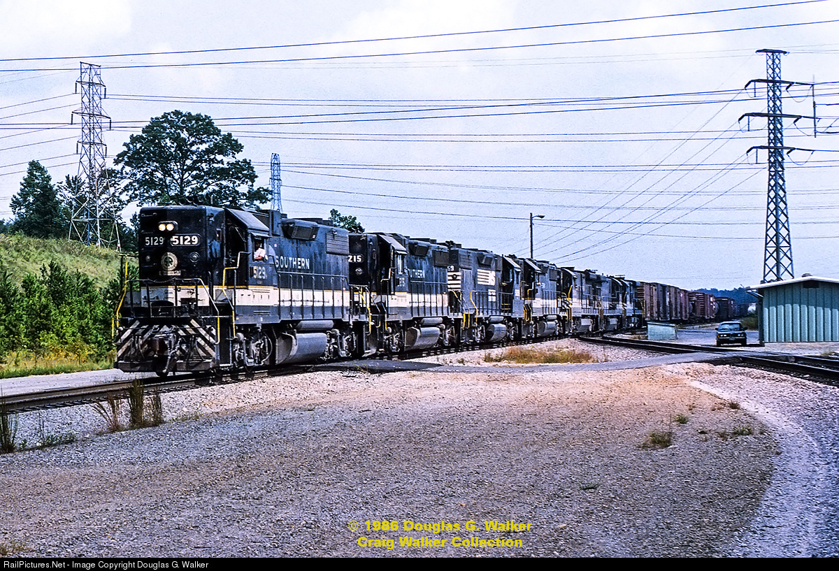 Running short-hood first, contrary to the way the control stand is set up. But, while Southern's hood diesels were set up as "long hood forward," they were considered to be bi-directional). Southern Railway GP38-2 5129 leads a Norfolk Southern freight out of the yard in Linwood, North Carolina, on September 30, 1986. An impressive lash-up of seven four-axle diesels from both EMD and GE, all except one still in Southern Railway paint.