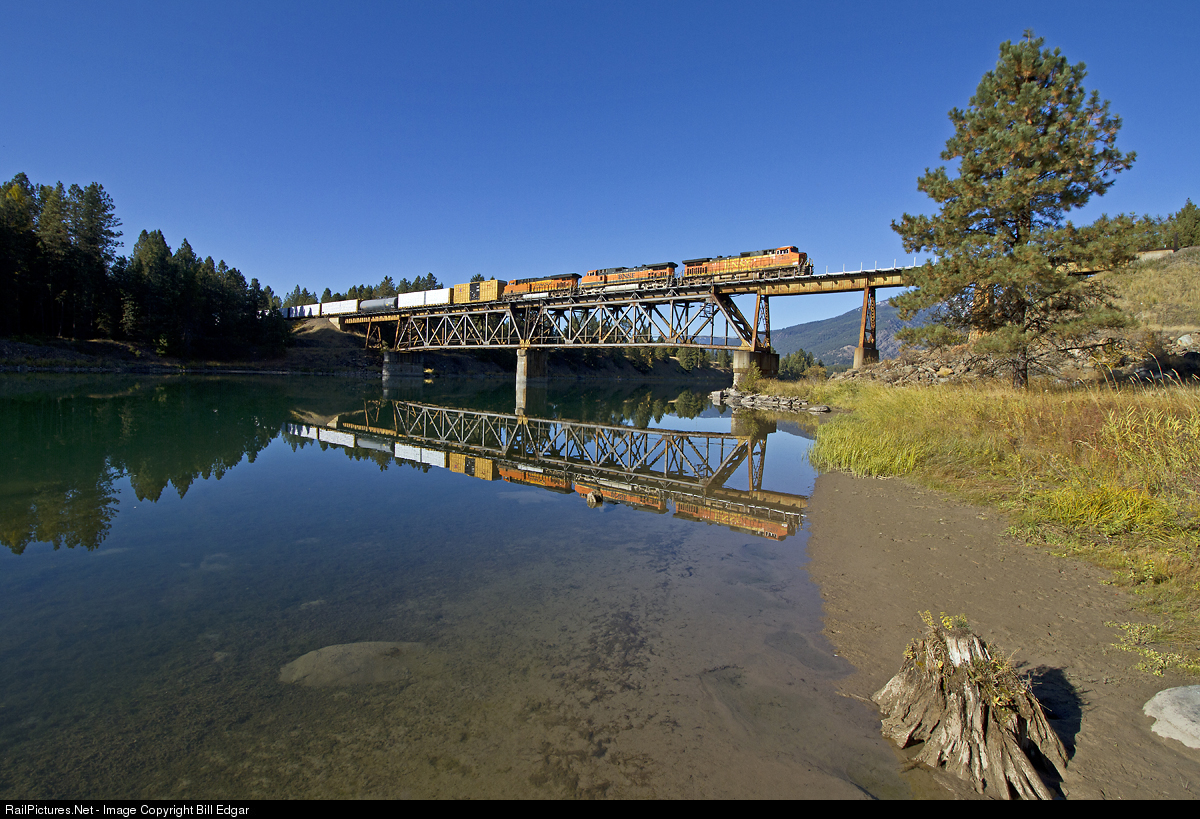 | A BNSF powered freight rolls across the Clark Fork on the Belknap bridge near Thompson Falls, MT on Montana Rail Link. The power displays the three major BNSF color schemes utilized by the BNSF since its 1995 creation. |