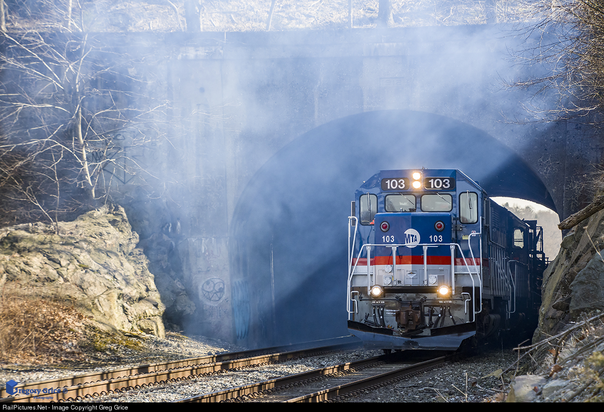 "Smoking Out Oscawana" Metro North GP35rs 103 & 108 emerge from the Oscawana Tunnels towing a rail train up Track 4 on the upper Hudson Line. The train dropped continuously welded rail (cwr) on Track 4 at various locations between CP36 and CP39 in the Cortlandt area before tying down for the evening at CP39.