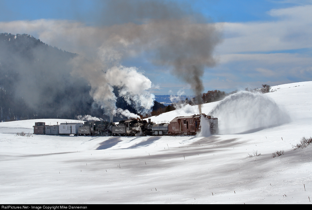 Cumbres & Toltec Scenic Railroad steam Rotary OY, pushed by K-36 Mikado locomotives Nos. 487 and 484, approaches the Highway 17 grade crossing above Dalton, New Mexico, on February 29, 2020. The special run of the plow train featuring OY on the four percent grade up 10,015-foot Cumbres Pass kicks off the 50th anniversary celebration of the railroad this year.