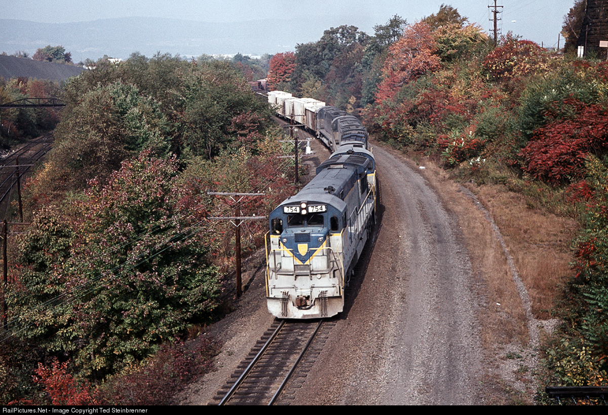 D&H/LV run-through NE-87 has D&H power on this colorful fall day. This must have been a heavy train, as U33C 754 is likely a front-end helper for the 3 C628s on a train that also had U30C 703 pushing. The train is on the D&H and is about to cross over the LV (at left in the photo) and then take the Dupont connection to switch to the LV for the trip to Allentown. The vantage point for this picture is the Pittston Avenue bridge. R.T. Steinbrenner Photo