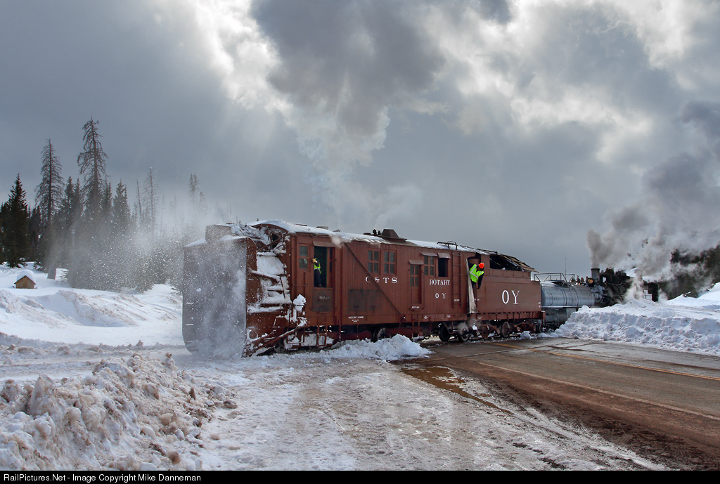 This is about as far as Cumbres & Toltec’s Rotary OY outfit train is going to plow on March 1, 2020. It was quickly stopped after breaking though the crusty snowbank along Highway 17, and is now riding on ice-filled flangeways on the eastern side of the highway. A large accumulation of snow was deposited here by highway plows, and all the activity over on this side of the crossing caused a lot of ice buildup too. Since the crew was getting low on time, it was quickly decided to head back to town and call it a day. Better doing this than possibly derailing a rotary plow on top of a state highway crossing.