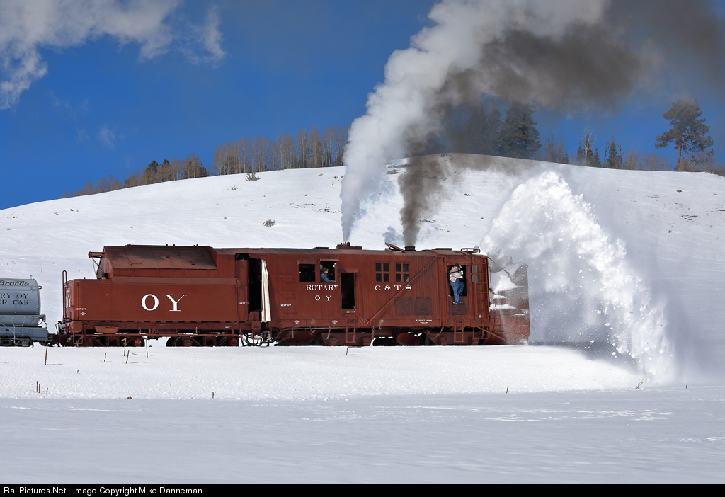 Cumbres & Toltec Rotary snowplow OY clears the narrow gauge right-of-way eastbound upgrade toward Cumbres Pass just above Dalton, New Mexico, on February 29, 2020. Engineer Max Casias, located in the window above the “Rotary OY” lettering, concentrates on the task at hand as the machine removes snow. Because of limited visibility, he gets some of his information on how much throttle is needed on the plow by a pilot up front on the right side of the rotary, who happens to be his father, Marvin Casias.
