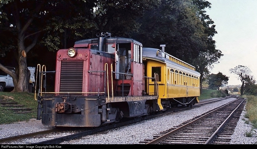 | The Strasburg's GE 44-tonner at Groff's, heading up a Lancaster Chapter NRHS picnic special in the mid-1980s. No. 33 was built by GE as the PRR 9331 in July of 1948. Note the lighter-weight iron, which has recently been replaced by 136-lb rail to accommodate the Strasburg's modern-day heavy freight service. |