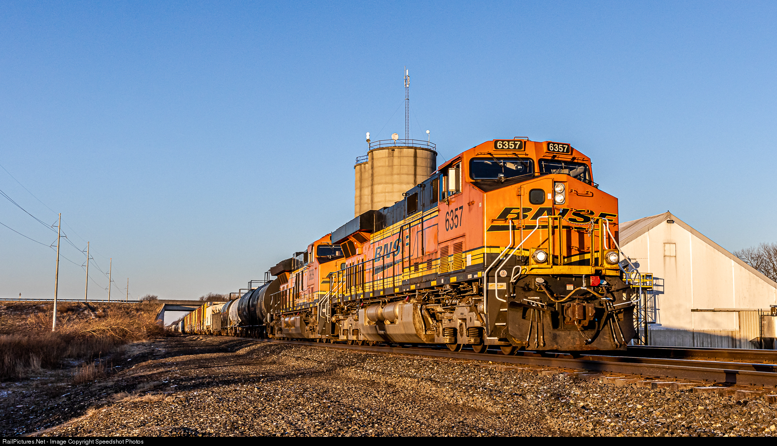 BNSF 6357 races Eastbound in front of the elevator in New Carlisle Indiana in the early morning sunrise