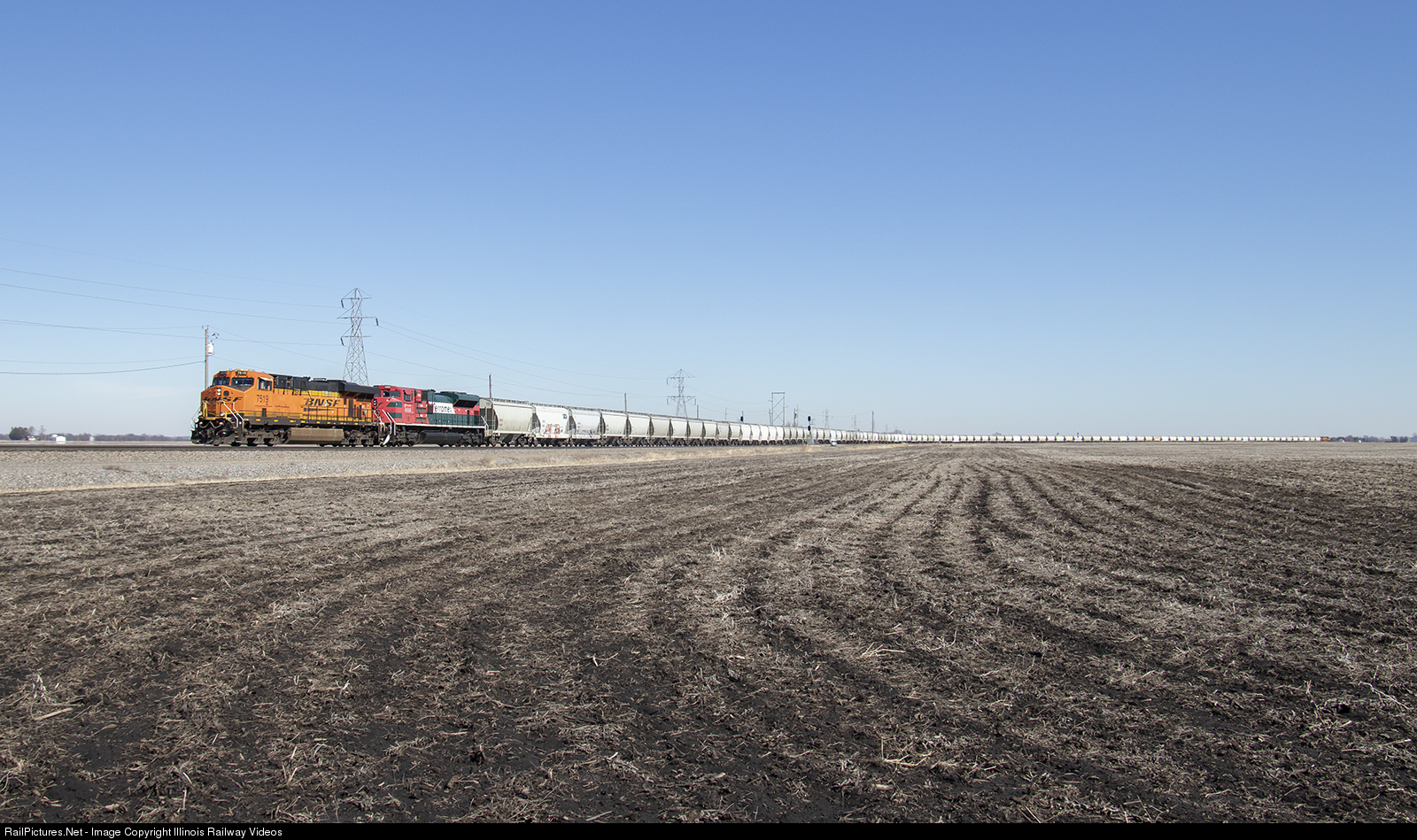 | A bright, sunny day in Galesburg mixed very well with consistent freight traffic; seen here as represented by a westbound grain train. |