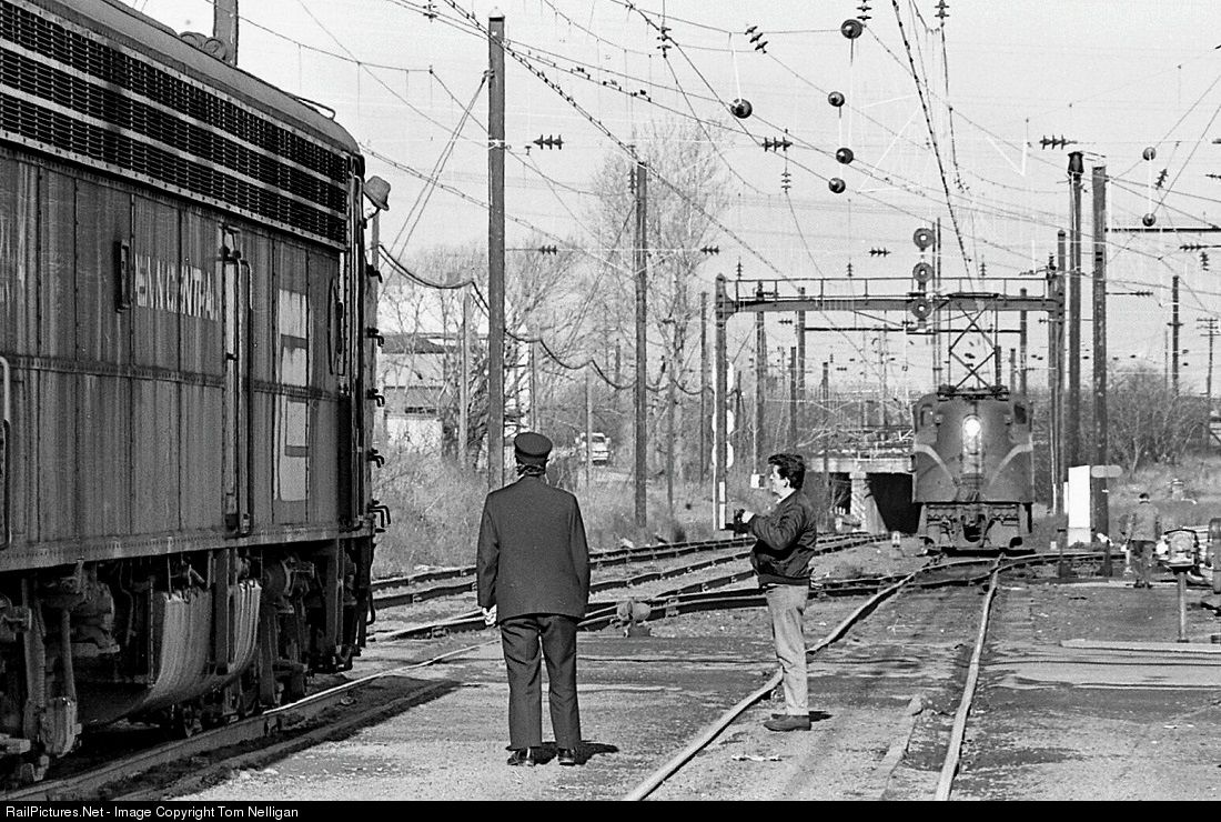 For decades, an engine change at South Amboy, NJ, was a ritual for New York & Long Branch/North Jersey Coast Line trains headed to or from Penn Station. Once the crew conference is complete the Penn Central E8s that brought this train north from Bay Head Junction will pull ahead and the waiting GG1 will couple on to head north.