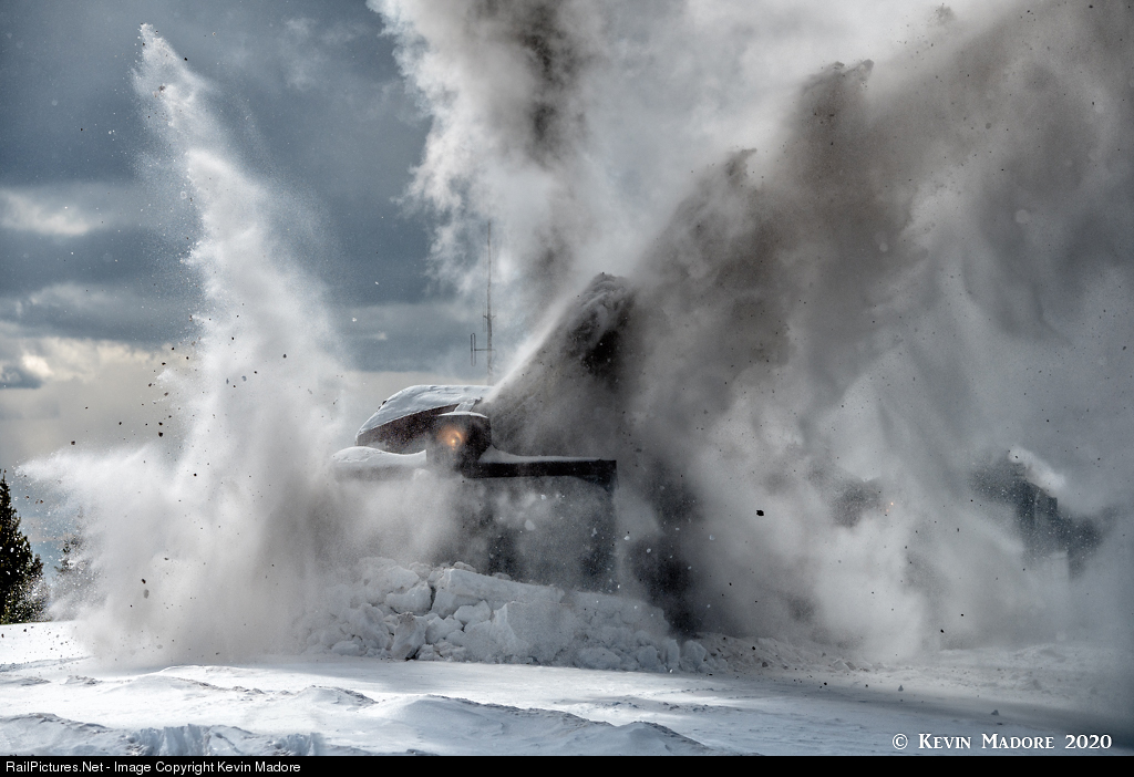 Impact! My camera captures the instant that the charging rotary outfit makes explosive contact with the dense, 4 ft. deep snow pack in the yard at Cumbres Pass. The violence you see out in front of Rotary OY is one reason why the railroad was so adamant about exercising positive control over this event, and not allowing a public free-for-all. As can be plainly seen, it is dangerous to be close to this machine, no matter what side you are on. Take a gander at the plume coming from the discharge chute. It's not exactly white. Clearly, there's some stuff in there that's not snow, and probably not soft. Fortunately, this was a long telephoto shot, taken from a couple of hundred feet away.