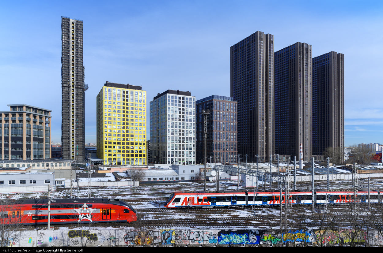 Stadler kiss and Ivolga meeting. "ESh2" Electric hight speed train "Stadler Kiss" goes from SVO airport. "ESh2 Eurasia" is the name of the "Stadler KISS" double-deck high speed electric express trains. These trains are used by 3 operators: Aeroexpress on Russian Railways, Azerbaijan Railways and Georgian Railways.