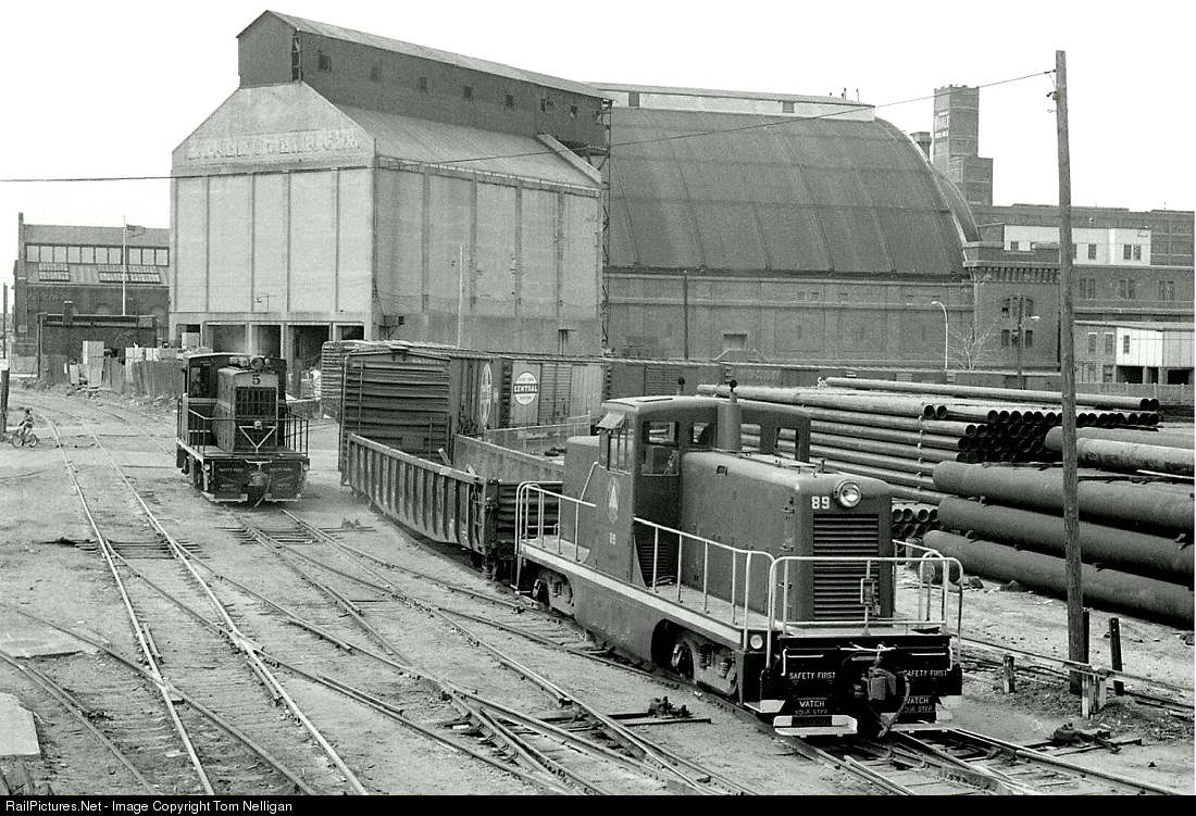 In an industrial corner of the old Brooklyn waterfront, Bush Terminal Railroad 80-Tonner 89 advances a cut of cars while one of the BT's primitive GE/Ingersol Rand switchers built in 1931 waits in the background to make its move.