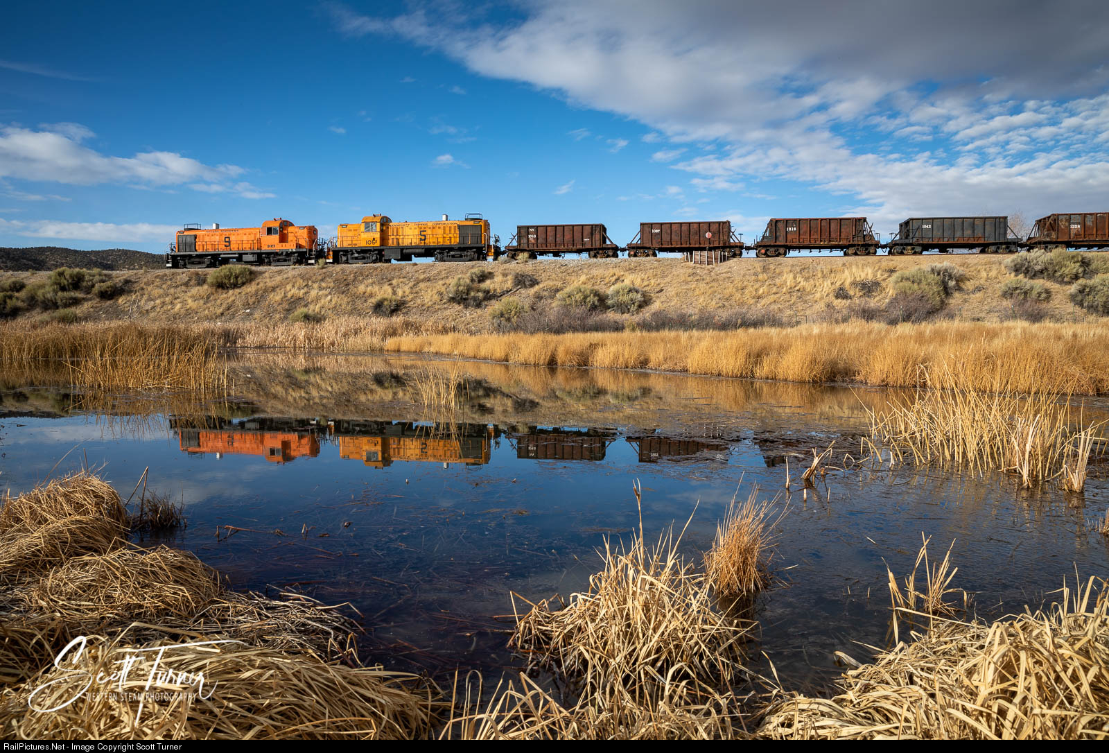 | As the sun sets, Nevada Northern Alco RS-3 #109 and Alco RS-2 #105 lead a string of empty ore cars out of the East Ely yard headed for the mine at Ruth. 2020 Nevada Northern winter photo spectacular. |