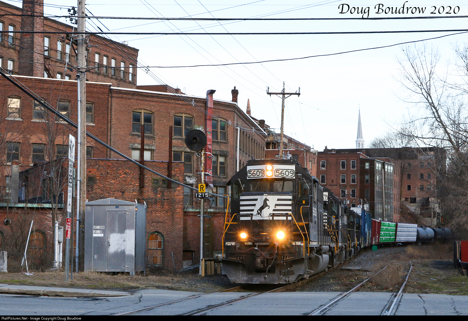 | As part of the continuous detour trains through Vermont for Pan Am Railways due to the Hoosac Tunnel collapse, manifest train 16R is seen headed South through Brattleboro, VT with a quartet of NS GP38-2s.