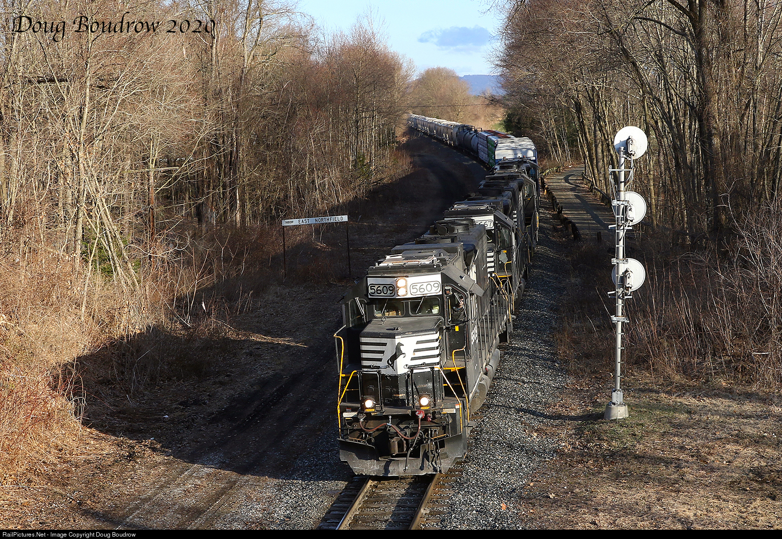 | As part of the continuous detour trains through Vermont for Pan Am Railways due to the Hoosac Tunnel collapse, manifest train 16R is seen headed South at the Vermont/Massachusetts state line in East Northfield with a quartet of NS GP38-2s.