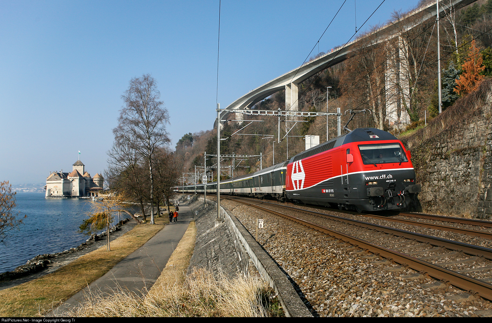 | On february 11th, 2008, the locomotive Re 460 # 016 of the SBB left the industrial plant in Yverdon with a brand new paint scheme. A few days later, she is pulling the Interregio 1429 from Geneva Airport to Brig anlong the shore of Lake Geneva and passing the Chillon castle from the 12th century. |