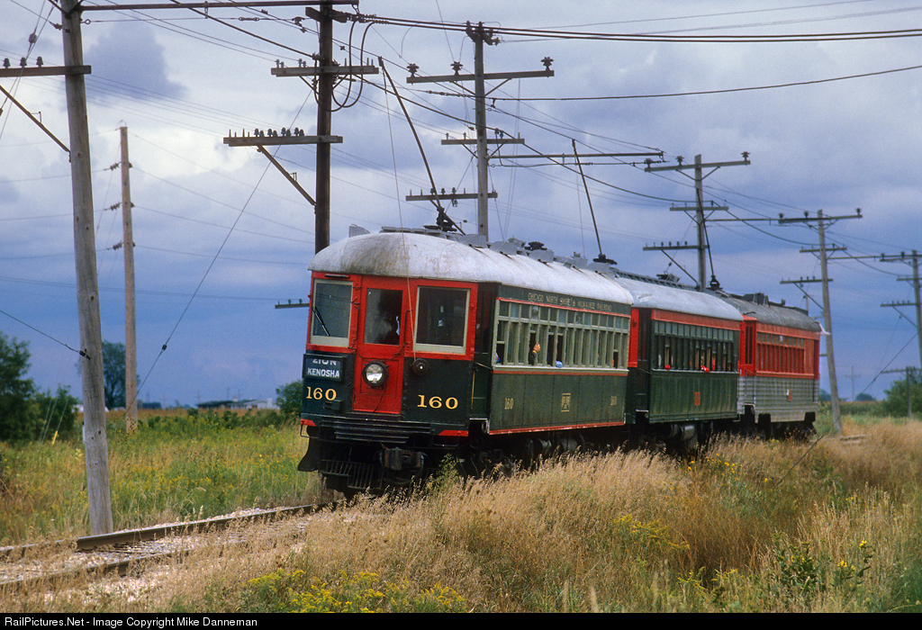 The Chicago North Shore & Milwaukee interurban cars, dressed in three different paint schemes, hum along the electrified main line at the Illinois Railroad Museum at Union, Illinois, in September 1984. CNSM car No. 160 is a steel coach built by Brill in 1915.