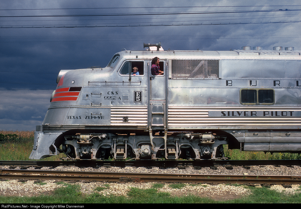 A lucky little boy gets to ride in the fireman’s seat of Colorado & Southern EMD E5 No. 9952-A as it powers a passenger train at the Illinois Railroad Museum in September 1984. C&S was a subsidiary of the Chicago, Burlington & Quincy (Burlington).