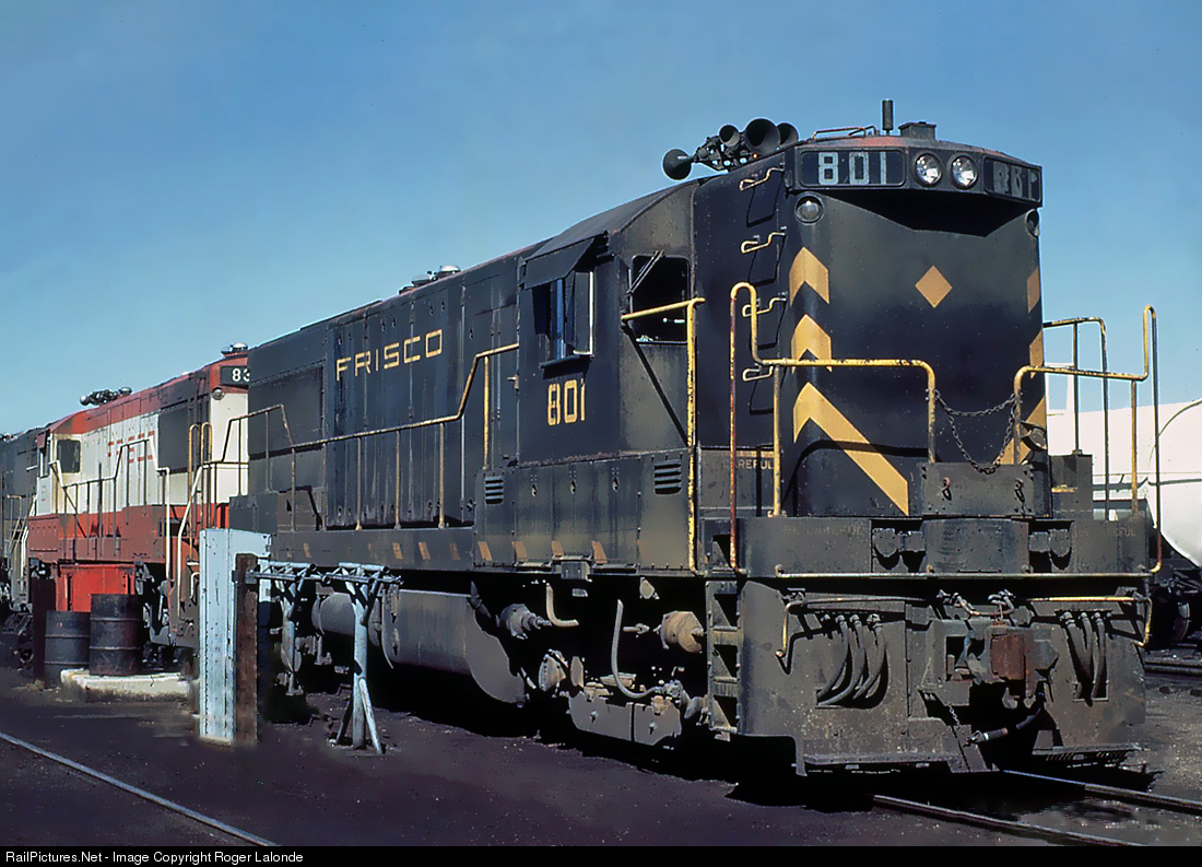 Frisco (SLSF) GE U25B 801 (800-807); The first eight U25Bs were high nose versions, the rest low-nose. Only Frisco and Union Pacific purchased the high-nose version. Photo from my collection, no photographer information on slide.