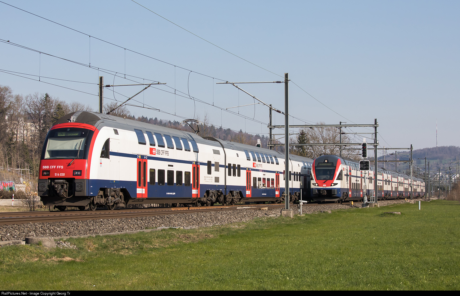 Meeting of doubledeck trains of the Zürich S-Bahn of Siemens and StadlerRail. On the left "DTZ" RABe 514 # 030 running as S24 line 20428 from Zug via Thalwil-Zürich-Airport-Winterthur to Weinfelden. On the right RABe 511 # 042 of the line S 11 train 19132 from Seuzach via Winterthur-Zürich-Dietikon-Lenzburg to Aarau.