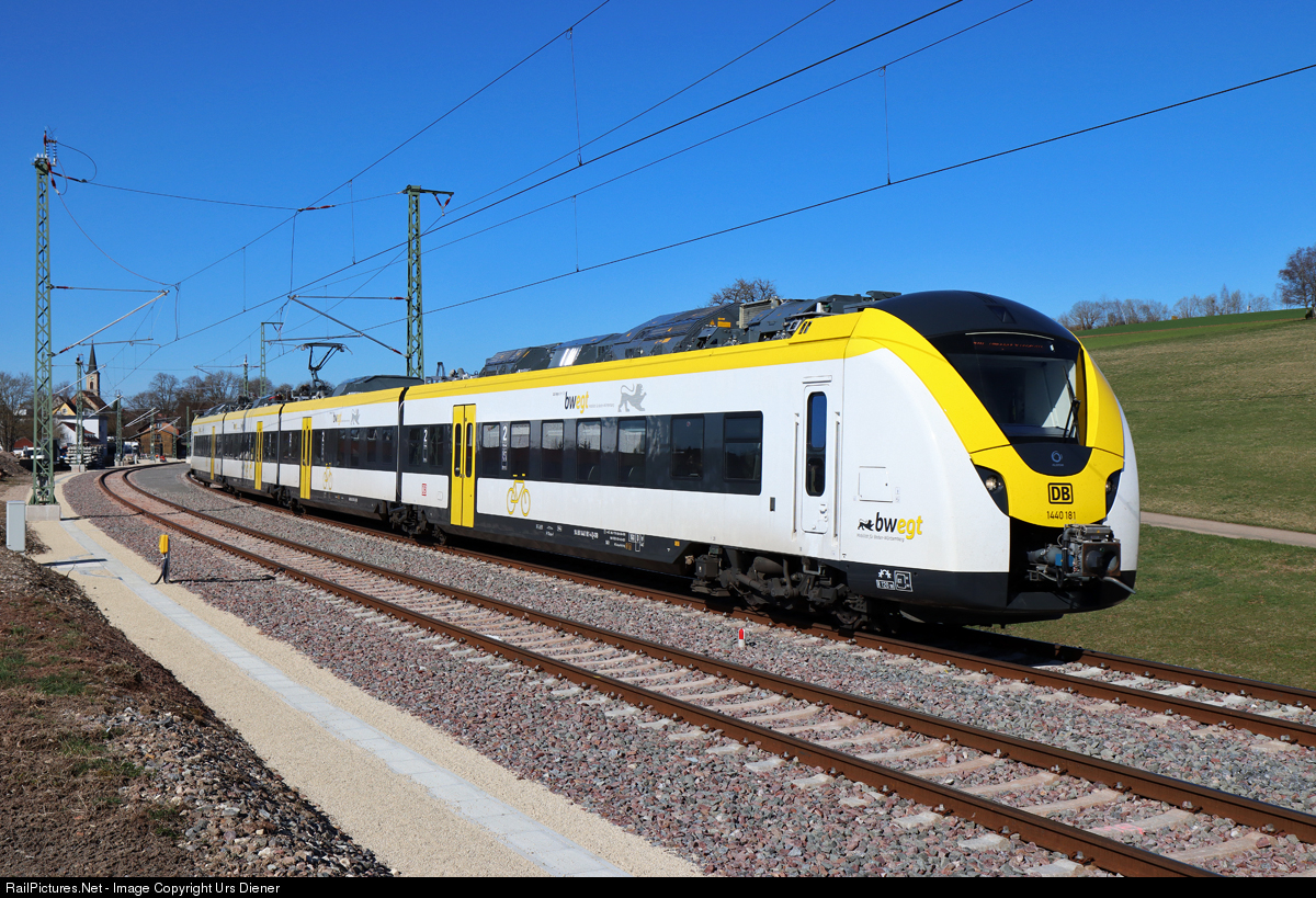| Four car articulated trainset Coradia Continental, built by Alstom and painted in the colors of the province Baden-Württemberg, on the way from Freiburg im Breisgau to Villigen-Schweningen. |