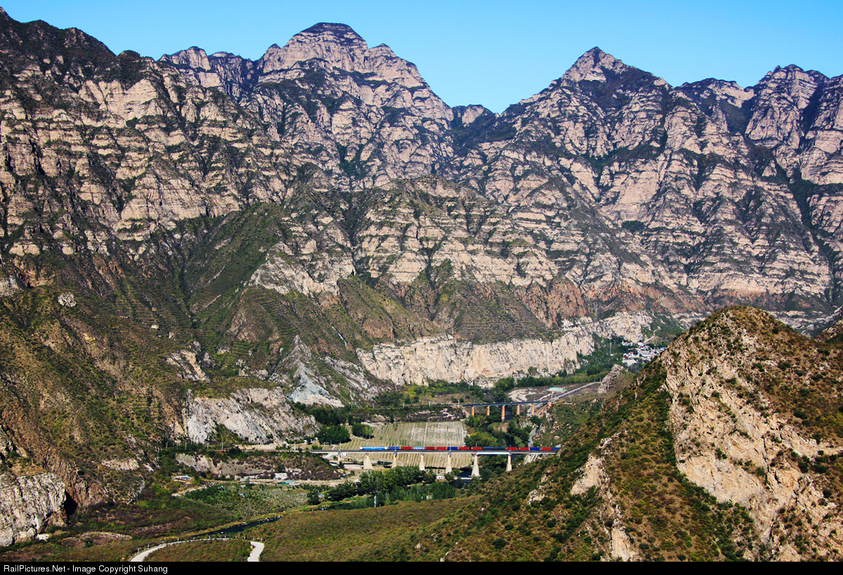| The Fengsha Railway crosses the Yanshan Mountains, and the train looks very small under the towering cliffs. |