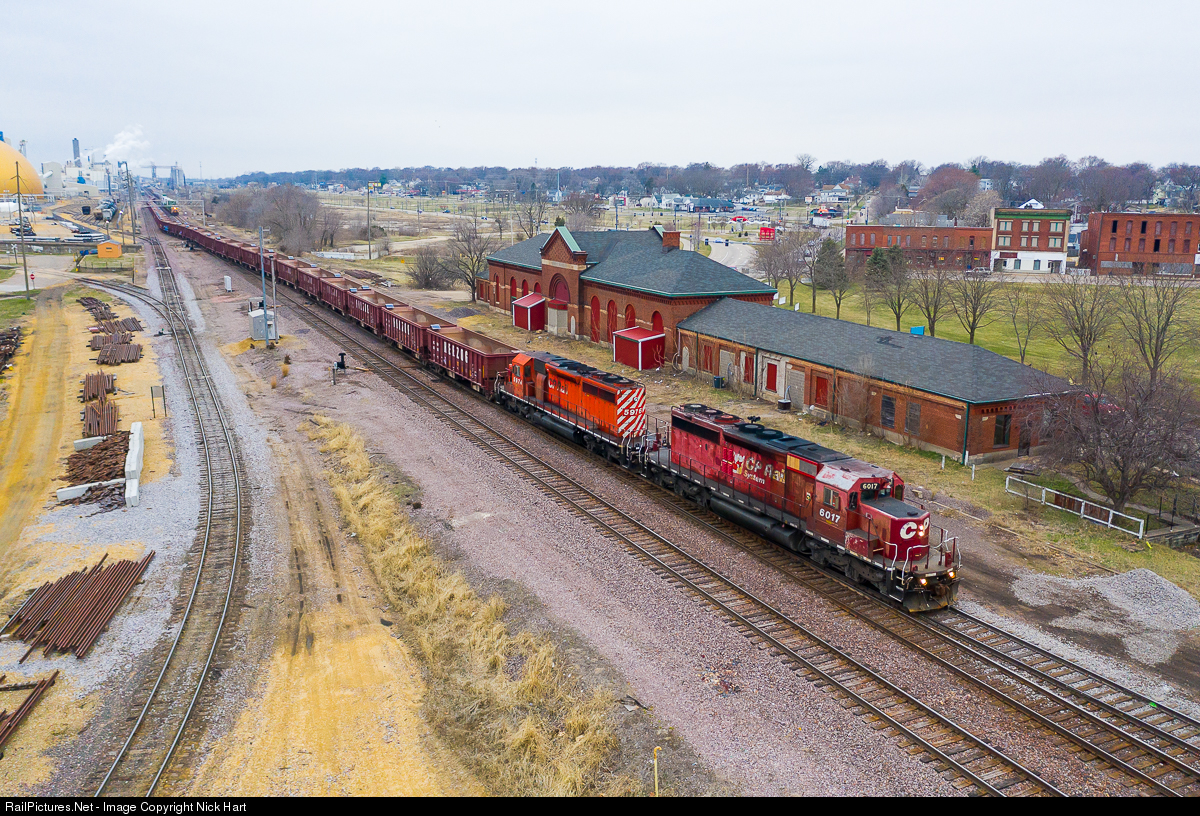 A classic pair of Canadian Pacific SD40-2's is in charge of an empty Herzog ballast train in Clinton, Iowa. Making their short trip down the UP Geneva Sub, the duo is seen passing the Chicago & North Western depot at the Fifth Street interlocking. Just up the line, the train will access CP River Sub trackage. In the next few years, UP plans to build a new bridge over the Mississippi River, which could very well put the venerable depot in jeopardy.