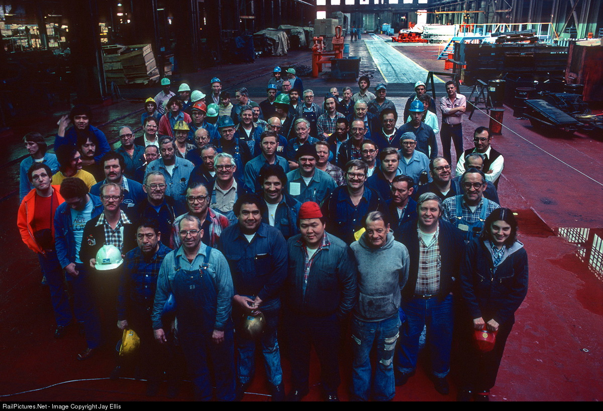 This group of employees of the Chicago, Rock Island & Pacific are working their last day at the Silvis shop. At 3PM second shift will go on duty and punch out at 11PM. At 11:59PM the Rock was gone.