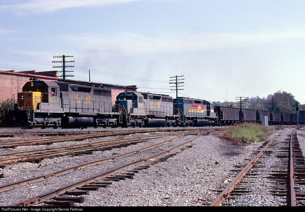 Louisville & Nashville SD40s #1227, 1247 & 1250 lead a northbound empty hopper train towards Etowah, Knoxville and Kentucky for another trainload of coal. #1227 was built June 1966 and later re# Seaboard System 1227, then Seaboard System/CSX 8303. Rebuilt to SD40M-3 and # SP 8640, then re# CEFX 3146