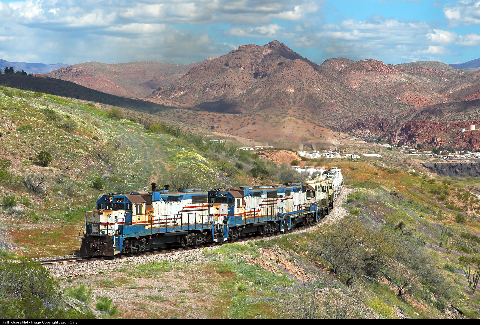 King of the Mountains 4.5%! Freeport McMoran Copper and Gold Company's "Hill Turn" conquers the grade above Clifton, AZ. This is the 1st of three Hill turns the FRI will make up the mountain on this day. The train consisting of 21 loads has the five venerable Geeps down to walking speed as they bite into the steepest 4.5% section of the grade.