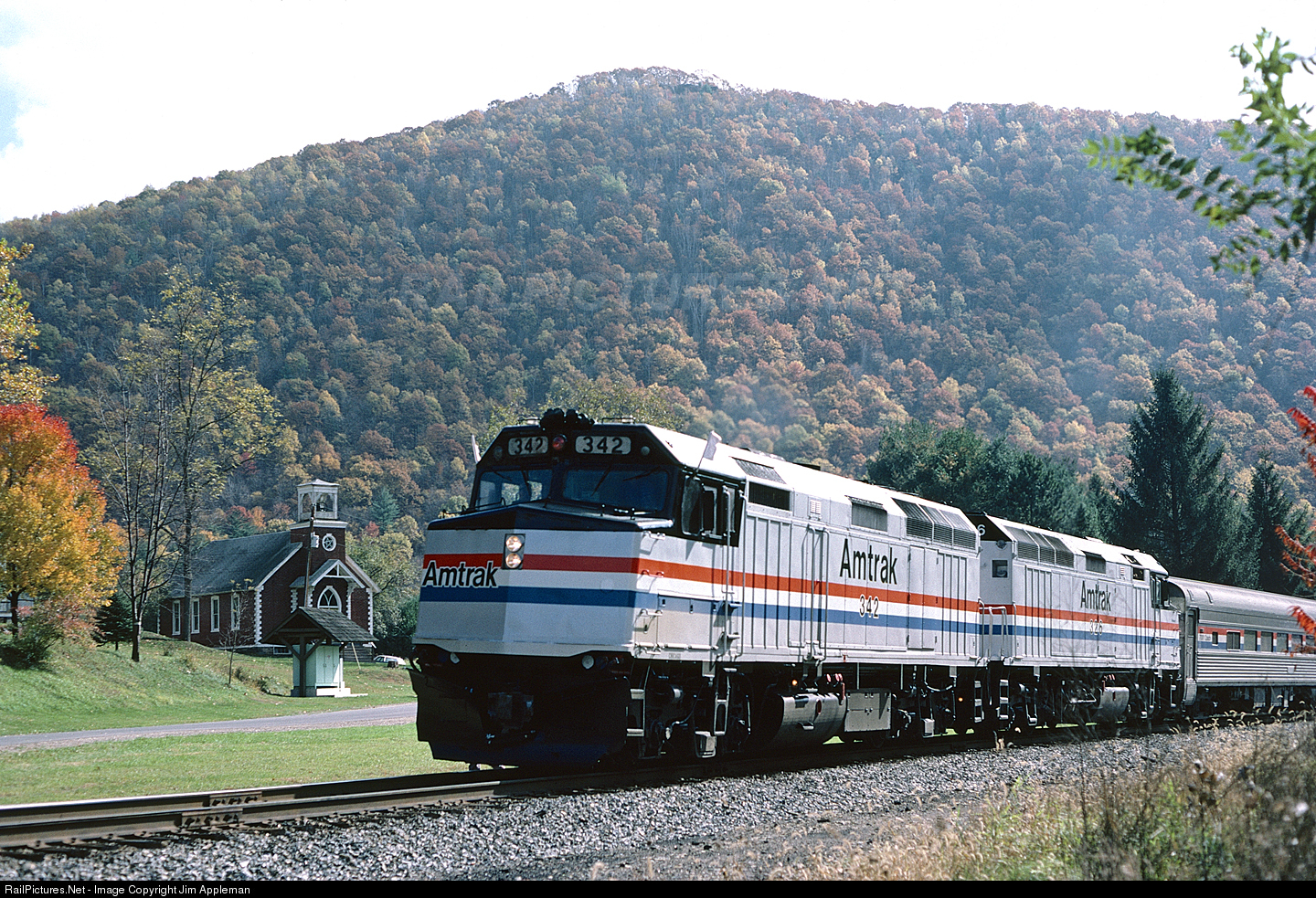 Amtrak 342 flies white "extra" flags leading an Amtrak excursion sponsored by the Lancaster, PA Chapter NRHS northbound through Pine Creek Gorge, the "Grand Canyon of Pennsylvania", to Wellsboro Junction. The train makes an unscheduled stop in Blackwell on Conrail's Corning Secondary. The train stopped for a medical emergency with one of the passengers, waiting for a first responder medical team to arrive. The head end of the train is stopped in the area where a railroad depot was once located, between the track and the Blackwell United Methodist Church seen in the background. The church, started in 1892 as the Blackwell Methodist Episcopal Church, features distinctive exterior wood siding that mimics brick masonry construction with stone quoins. The Corning Secondary would see its last through service trains less than one year later on Oct. 7, 1988. By late spring 1989, Conrail had the line dismantled from Wellsboro Junction to Jersey Shore. The scenic right-of-way is now the Pine Creek Rail Trail.