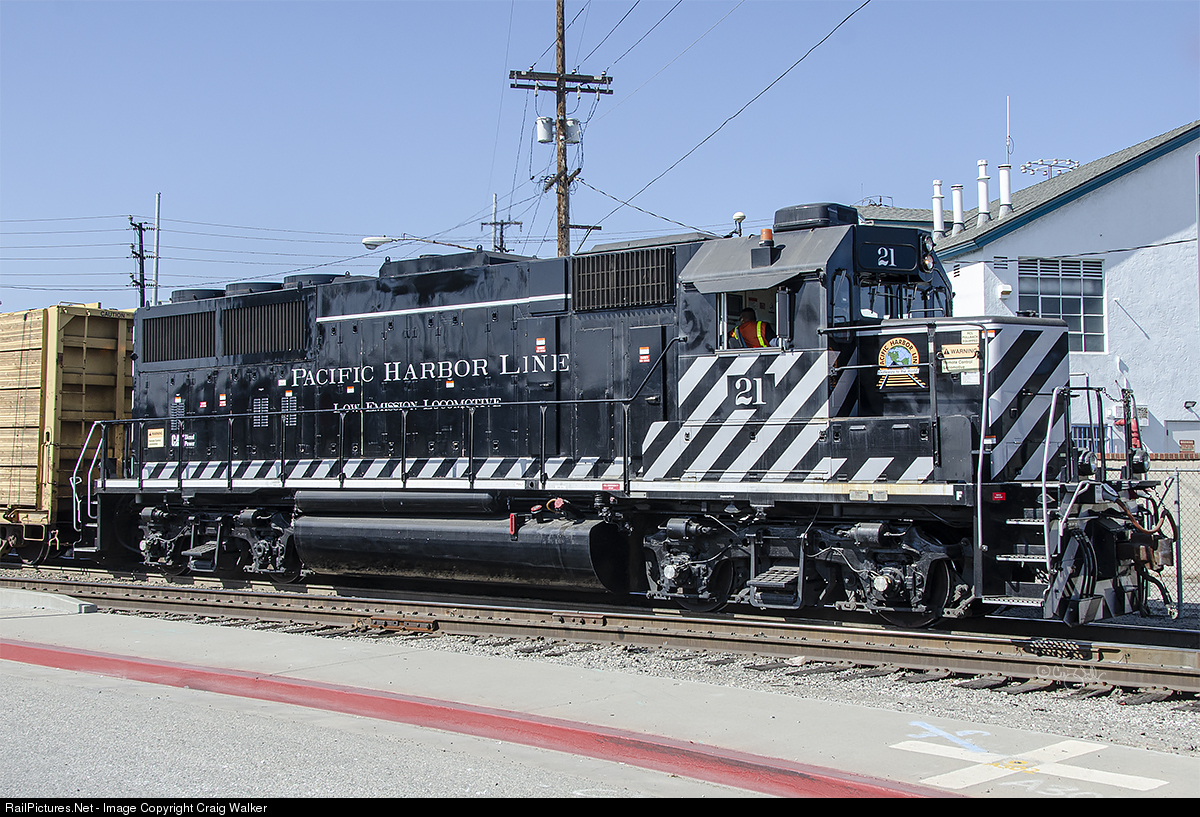 Pacific Harbor Line MP20B-3 21, originally Boston & Maine GP38 254 (originally Maine Central 254) rebuilt by Motive Power Industries into an MP20B-3, shoves a cut of cars into the PHL’s Pier A Yard. The PHL owns two MPI MP20B-3 locomotives (20 and 21) and this one made the news on March 31, 2020, when a deranged PHL engineer who believed in weird conspiracy theories tried to ram this engine into a US Navy Hospital Ship (USNS Mercy) during the COVID-19 pandemic. He missed hitting the massive ship by 500-or-so-yards when he tried to operate it in Run 8 across pavement and gravel. (Wilmington California – February 21, 2014)